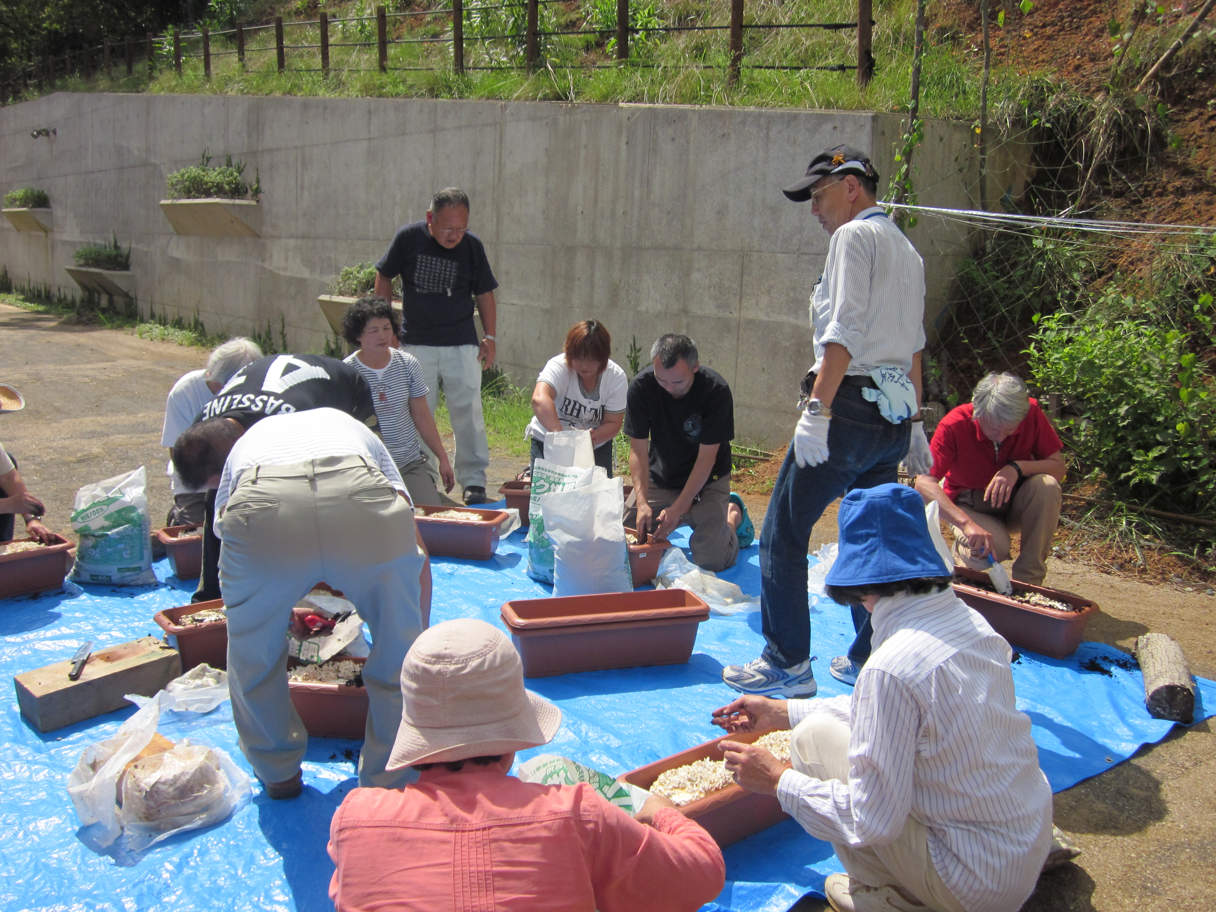 石田さんより、昨年栽培したハタケシメジの状態を見せていただいたり、ハタケシメジの栽培の仕方を詳しく聞き、プランターにバーク堆肥と2個の種菌を植えて完成しました。