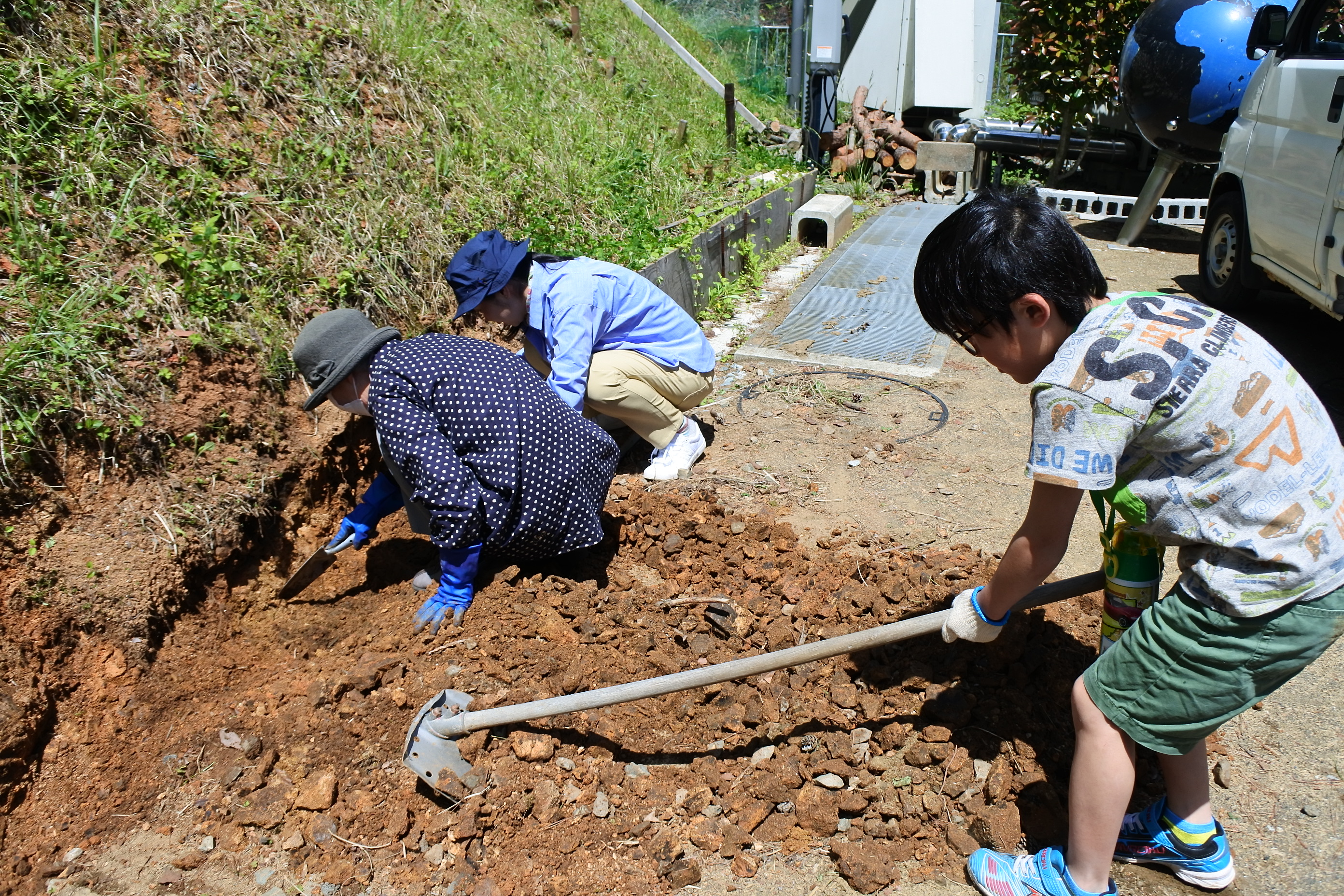 体験館の敷地内にジャコウアゲハが飛び交う環境を作るためのシリーズ講座。今月はジャコウアゲハの幼虫の食草「ウマノスズクサ」を植えるためのガーデン作り。硬い土を掘ったり、掘った土を篩いにかけたり、暑い中の作業となりましたが、皆さんのご協力により作業が大きく前進しました。