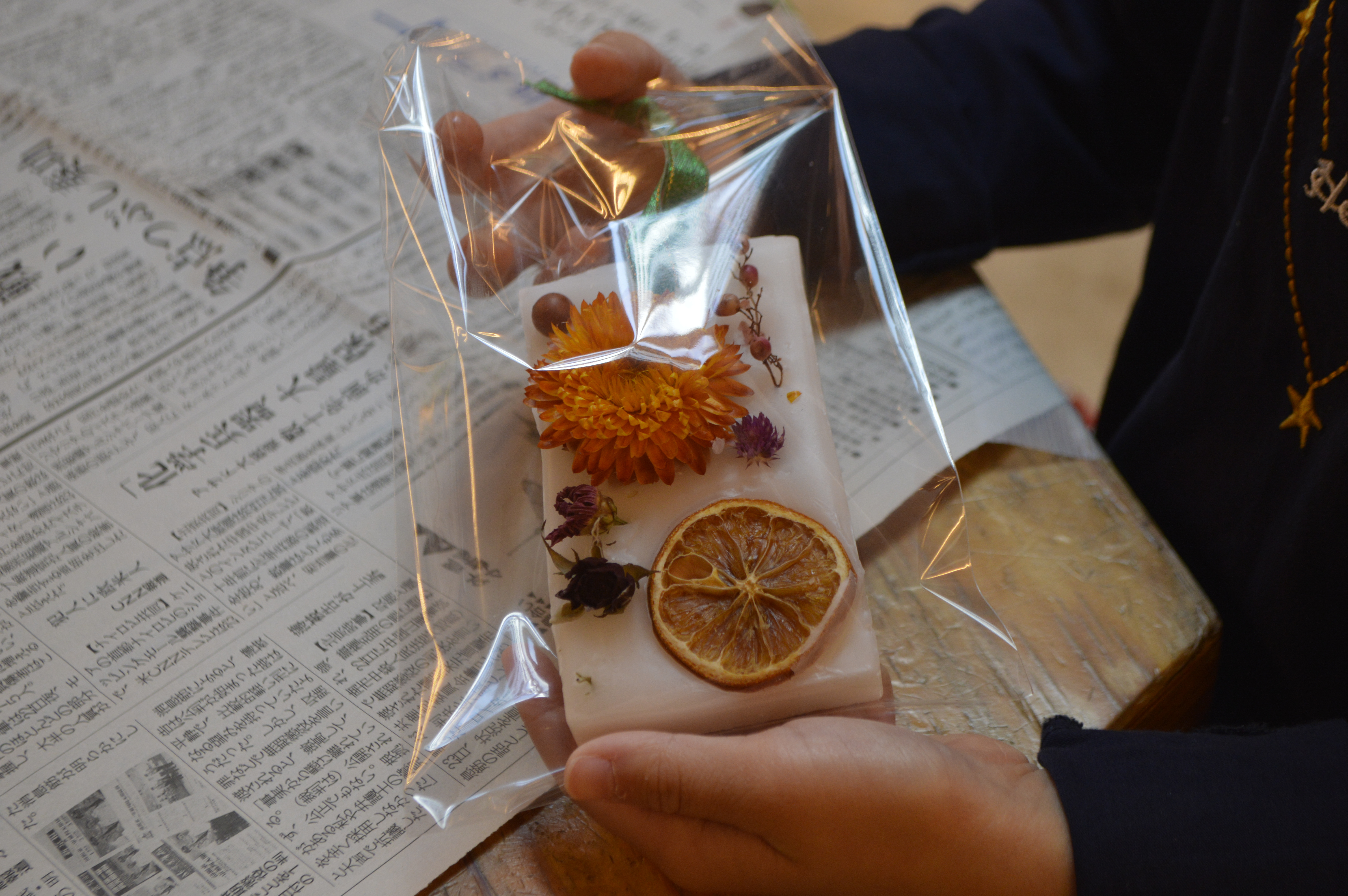 シリコンの容器に好みのアロマオイルとロウを入れ、飾りとしてドライフラワーや木の実、ドライフルーツを入れ固めると完成します。ロウを溶かして使うため、参加者は火傷に注意しながら世界に一つだけのサシェを作っていきました。