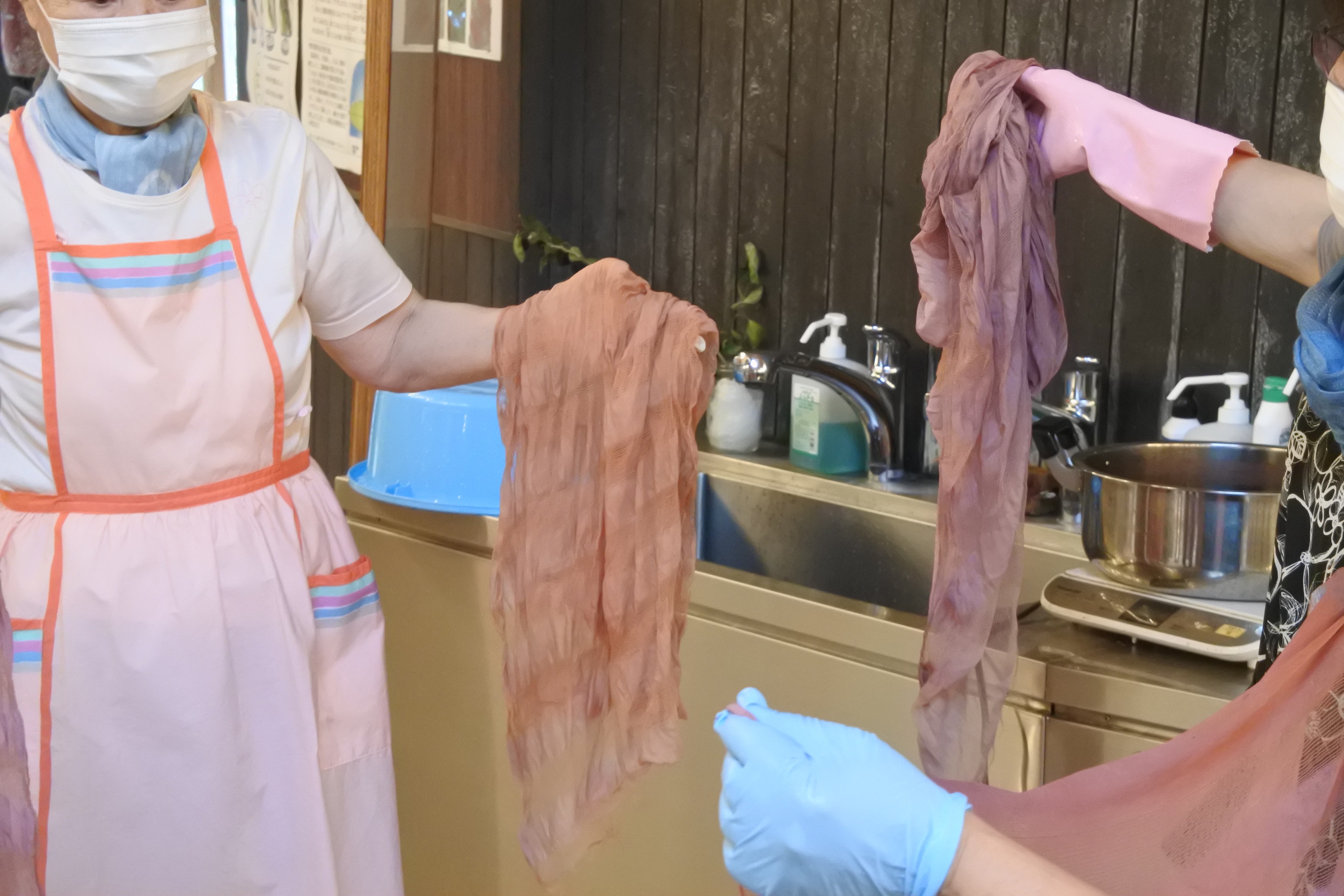 媒染液によって色味が変わるのが草木染めのおもしろいところ。鉄、銅、チタンの3種類の媒染液を使いました。媒染液によって、明るいピンク色に仕上がったり、紫色になったりと、変化を楽しむことができました。