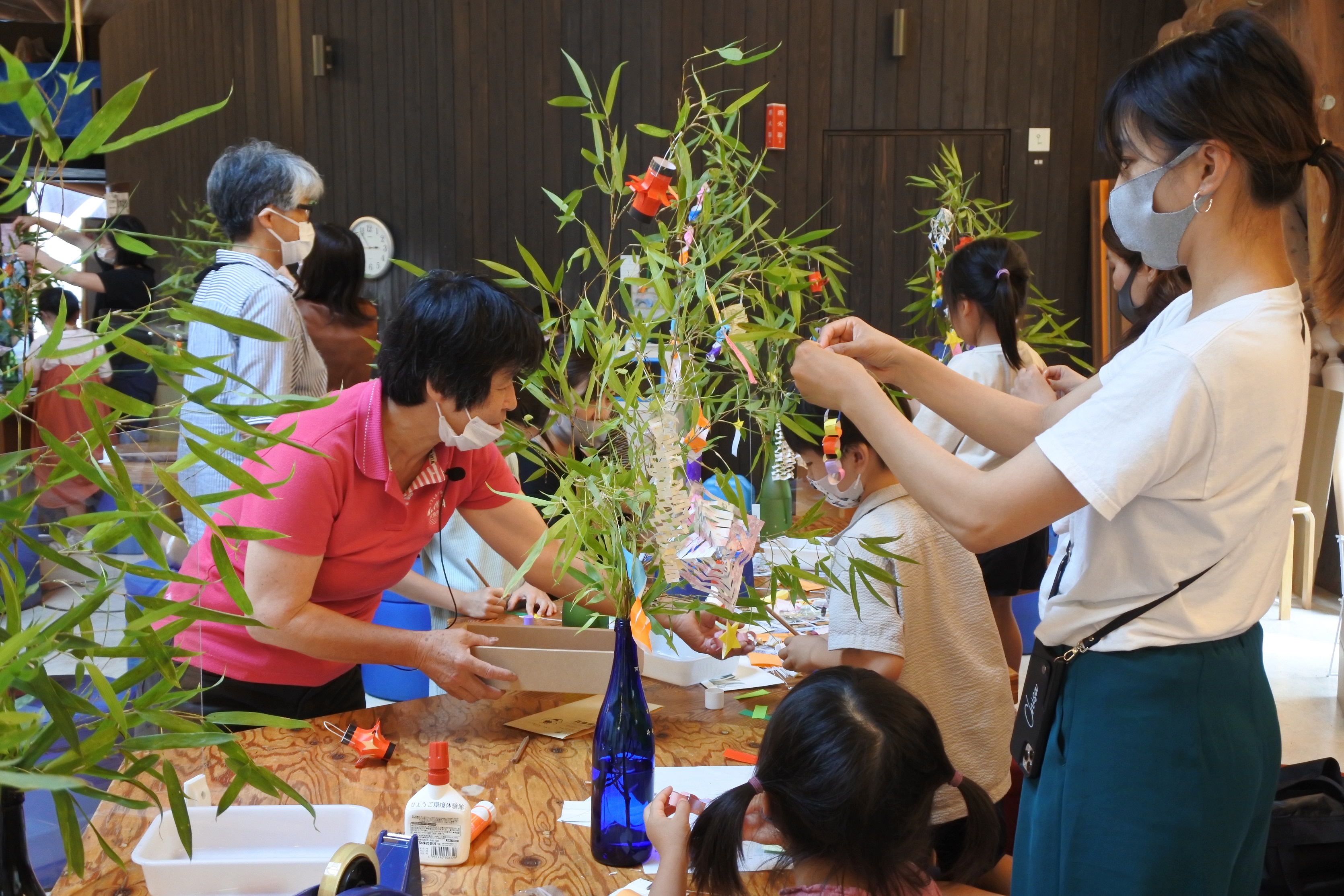 笹飾りのちょうちん、貝かざり、網かざり等を折り紙や包装紙で作りました。細かい作業となりましたが、親子で楽しく作ることができたようです。本物の笹に飾り付けて、この季節にぴったりな、素敵な作品が出来上がりました。
