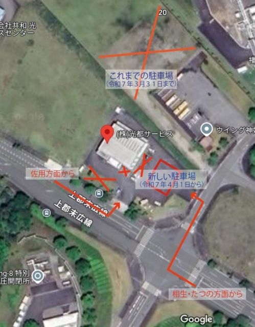 新しい駐車場(無料)は、株式会社光都サービス様の敷地内にあります。これまでの駐車場のすぐお隣です。
